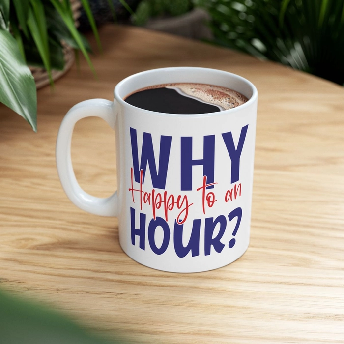 [Printed in USA] Why Happy to an Hour? - White 11oz Ceramic Coffee Mug